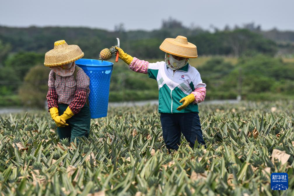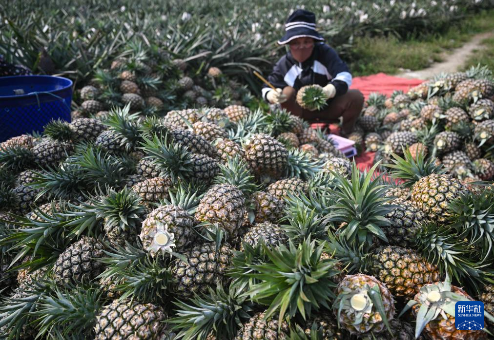 3月18日,村民在海南省文昌市锦山镇花园村采收凤梨。新华社记者 蒲晓旭 摄