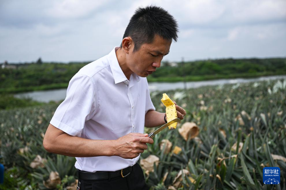 3月18日,韩衍在海南省文昌市锦山镇花园村查验凤梨口味和成熟度。新华社记者 蒲晓旭 摄