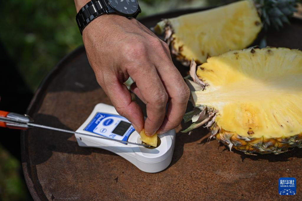 3月18日,韩衍在海南省文昌市锦山镇花园村测试凤梨糖度。新华社记者 蒲晓旭 摄