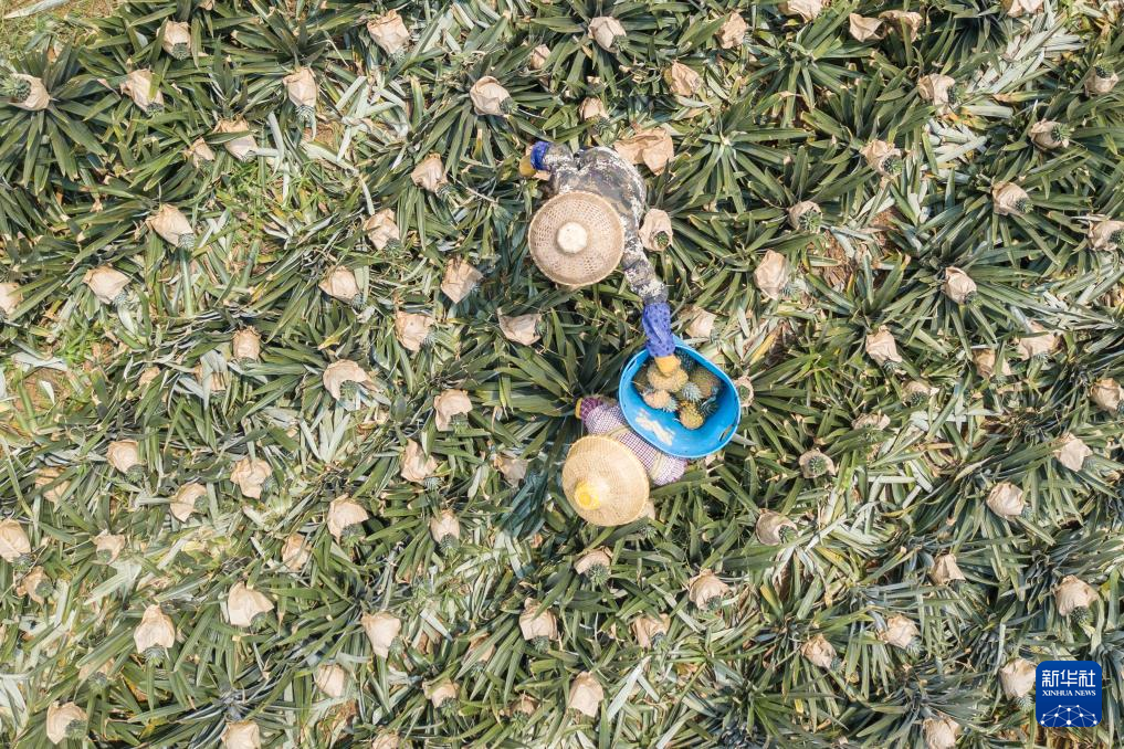 3月18日,村民在海南省文昌市锦山镇花园村采收凤梨(无人机照片)。新华社记者 蒲晓旭 摄