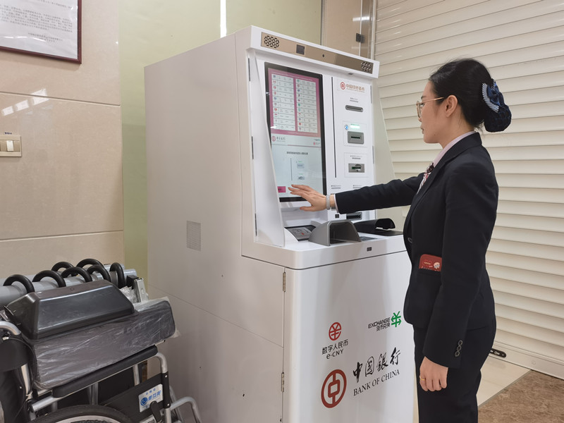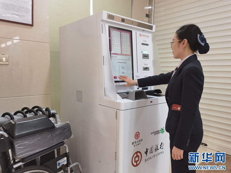 中国银行博鳌支行工作人员演示数字人民币外币兑换机使用方法。新华网发