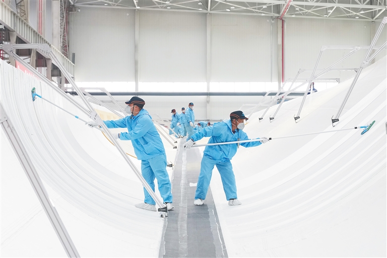 在东方明阳新能源高端装备产业基地,工作人员正在制造MySE292海上超大型叶片。该叶片长143米,叶轮直径达292米,为全球已下线叶轮直径最大的风电叶片。海南日报记者 武威 摄
