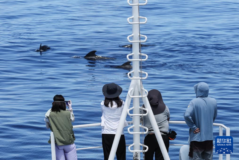 7月6日,在海南岛东部海域,蓝丝带海洋保护协会秘书长蒲冰梅(左二)在船头拍摄观测短肢领航鲸。
