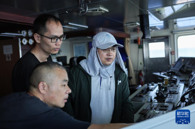 7月5日,在海南岛东部海域,考察团队成员在驾驶室内查看船舶航行信息。