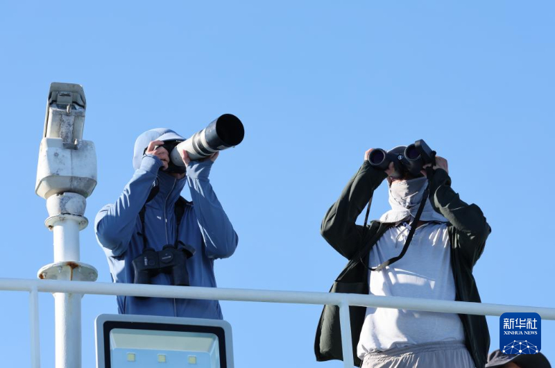 7月6日,在海南岛东部海域,考察团队成员在甲板上拍摄观测短肢领航鲸。