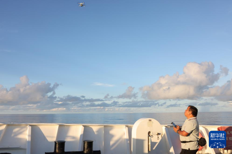 7月6日,在海南岛东部海域,考察团队成员在操作无人机进行拍摄观测。