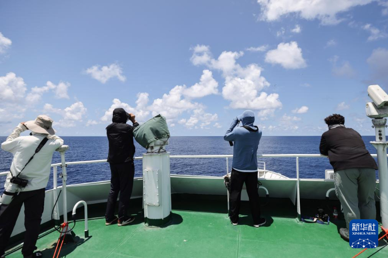 7月7日,在海南岛东部海域,考察团队在甲板上观测寻找“海棠”。