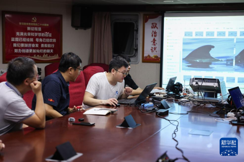 7月7日,在海南岛东部海域,考察团队在船上开会分析拍摄到的短肢领航鲸照片。