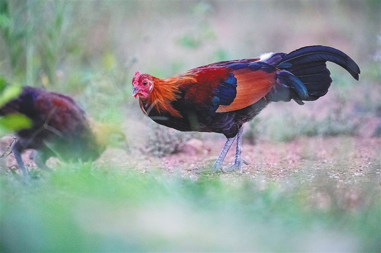 在海南,红原鸡大多栖息于海拔较低的山地丛林、橡胶园的防护林带及经济作物区地缘的灌丛之中。“红原鸡进村觅食时常发生,一部分红原鸡还会和家鸡杂交。”海口畓榃湿地研究所所长卢刚说。(海南日报全媒体记者刘宁玥 苏庆明 通讯员卓海芳 何惠)