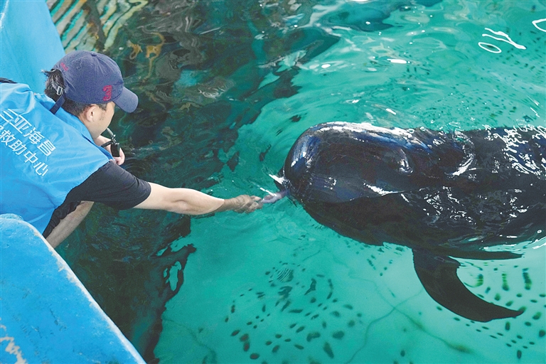 7月31日是短肢领航鲸“海莉”搁浅获救的第14天,它在三亚海昌生物保育中心恢复状态良好。目前是“海莉”恢复期比较关键的阶段,待血检结果恢复正常后,工作人员考虑将其转入室外大水池中进一步康复训练。