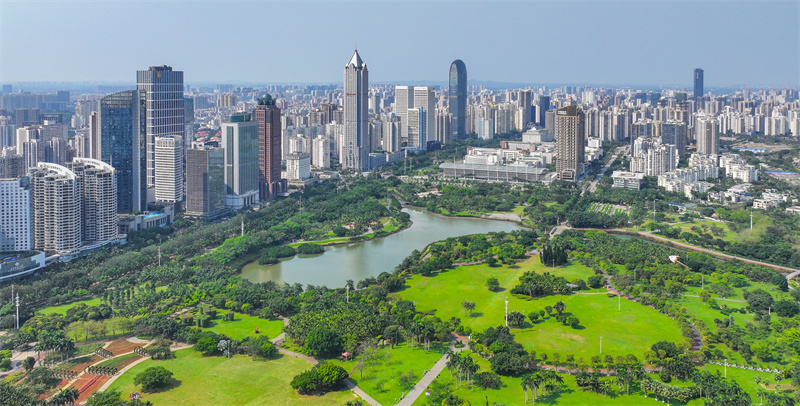 在海口万绿园俯瞰海口龙华区。新华网发