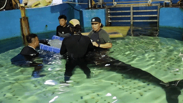 8月2日,在海南三亚海昌生物保育中心,志愿者在救助池边观察短肢领航鲸“海莉”。
