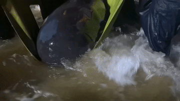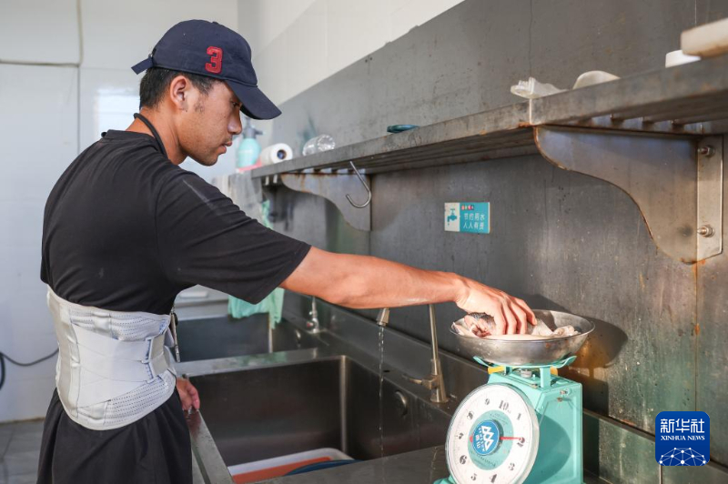8月2日,在海南三亚海昌生物保育中心,保育员给短肢领航鲸“海莉”的食物称重。