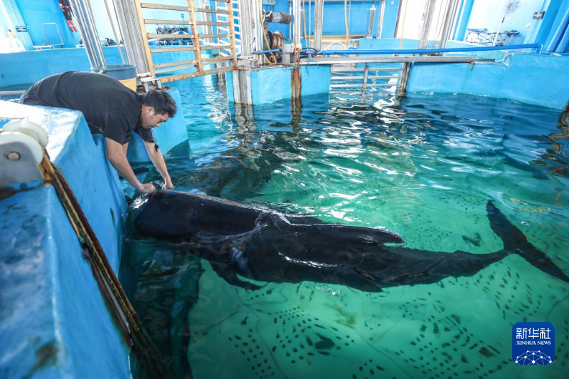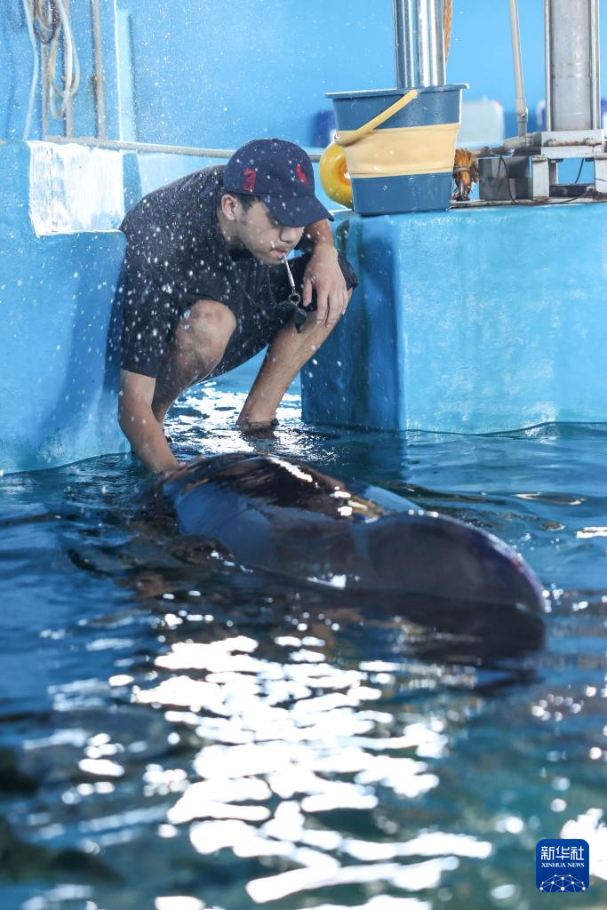 8月2日,短肢领航鲸“海莉”在海南三亚海昌生物保育中心的救助池内游动。