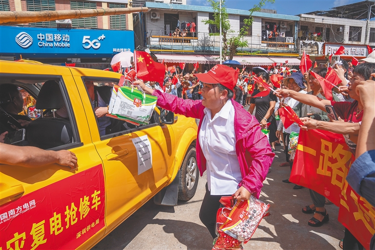 在文昌市翁田镇文政路,群众将海南特产塞给南方电网深圳供电局的工作人员。海南日报全媒体记者 李天平 摄