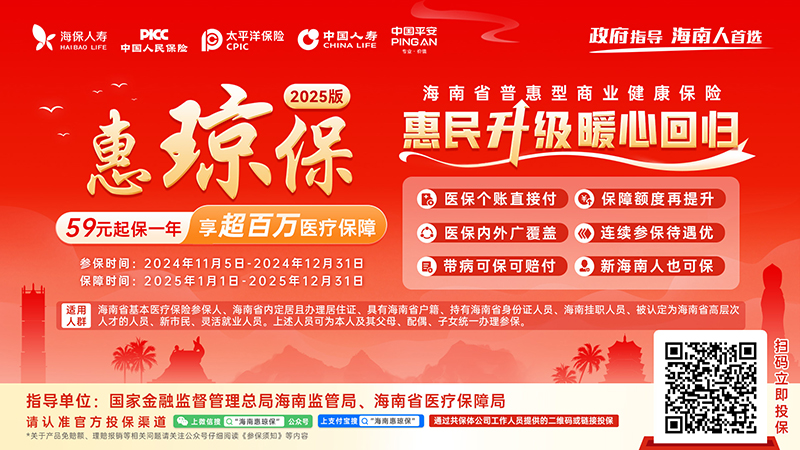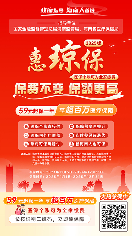 即日起,海南人民可关注官方投保平台“海南惠琼保”微信公众号,为本人及家人进行投保。参保期截至2024年12月31日,保障期为2025年1月1日至12月31日。
