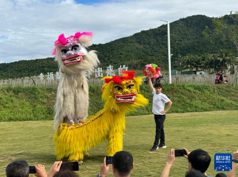 一曲海南民歌过后,北京市代表团舞狮队表演了《狮韵中华》,两只栩栩如生的舞狮随着音乐入场,欢快地舞动着,引得海南省代表团运动员和当地群众拍手叫好。