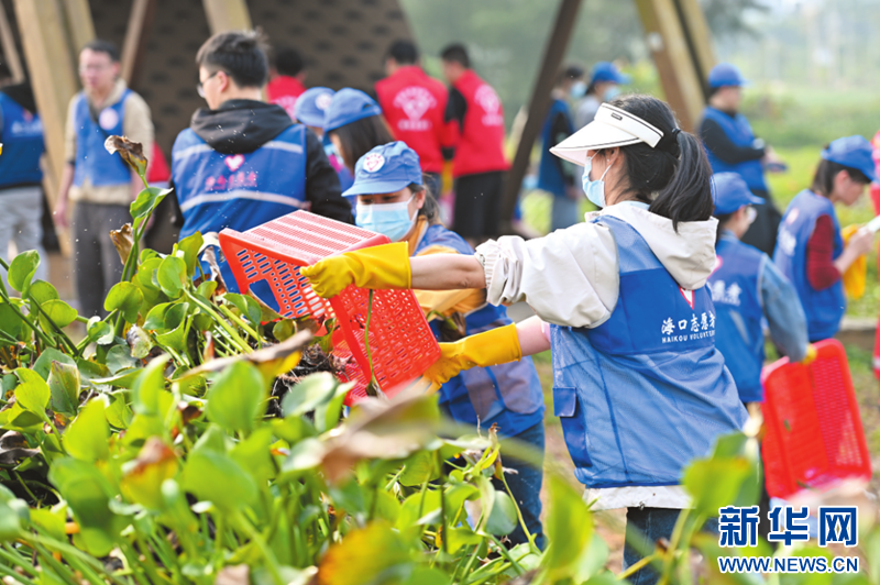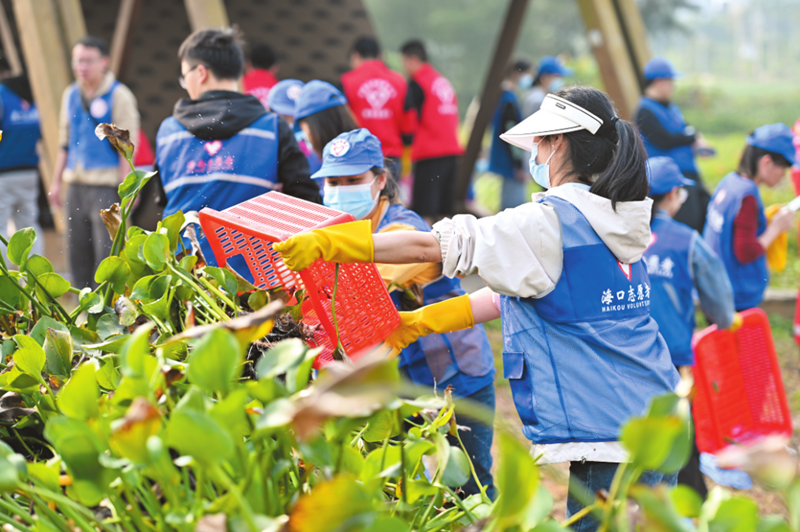 志愿者清理路边绿化带内的垃圾和落叶。海南省委文明办供图