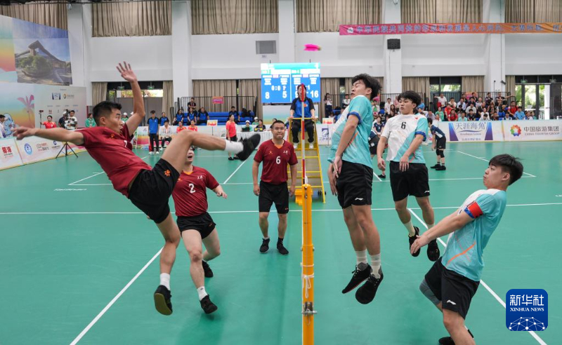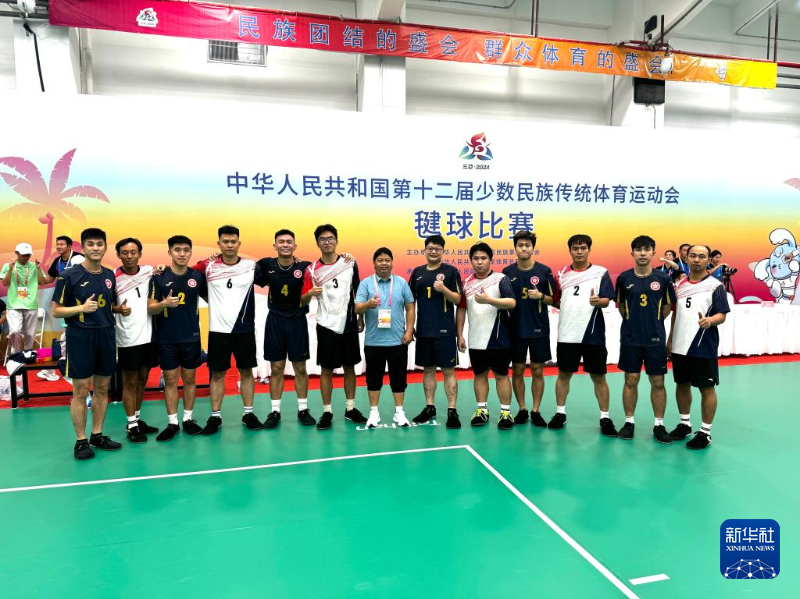 11月24日,第十二届全国少数民族传统体育运动会毽球男子三人小组赛在海南省三亚市举行,图为天津队和广西队比赛现场。新华社记者 晋美多吉 摄