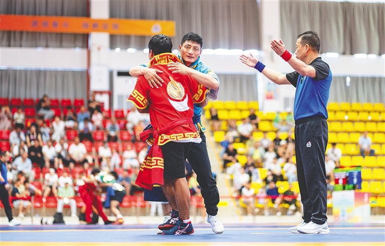 十一月二十四日,民族式摔跤项目比赛在三亚市一中体育馆里进行,运动员精彩的表现引得现场掌声不断。比赛结束后,运动员拥抱致意。海报集团全媒体记者 刘孙谋 摄