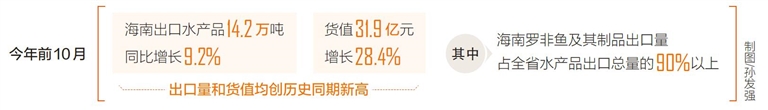 今年以来,海南水产品出口数据持续飘红,彰显外贸活力。海口海关11月25日公布数据显示,前10月,海南出口水产品14.2万吨,同比增长9.2%;货值31.9亿元,增长28.4%,出口量和货值均创历史同期新高。