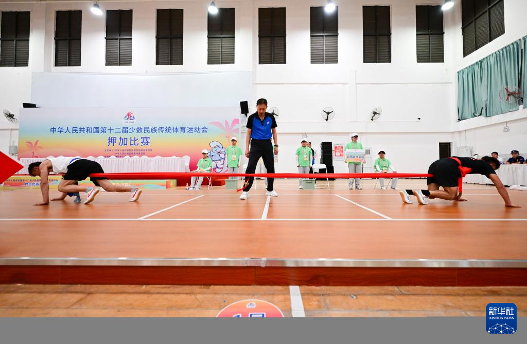 11月24日,新疆队选手额热斯别克·居马德里(左)和云南队选手陈赵龙在比赛中。当日,第十二届全国少数民族传统体育运动会押加项目55公斤级第一阶段第三轮比赛举行。新华社记者 周牧 摄