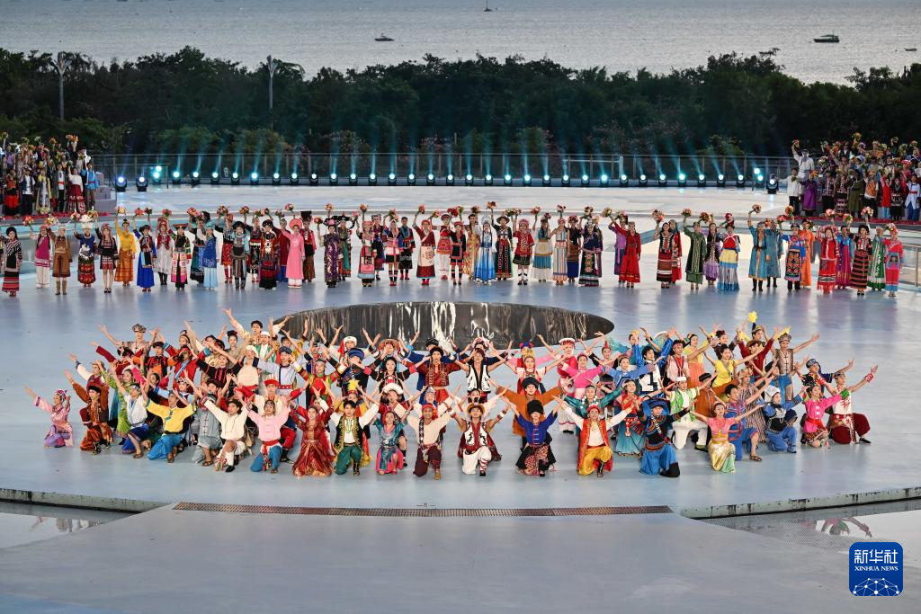 在“天涯海角星”纪念雕塑附近,台湾少数民族代表团表演者身着特色民族服饰,手拉手围成一个圆,在《我们都是一家人》的歌声中,为观众献上热情舞蹈。不少代表团成员进入圆圈中,用手机将这份欢乐与温馨定格。