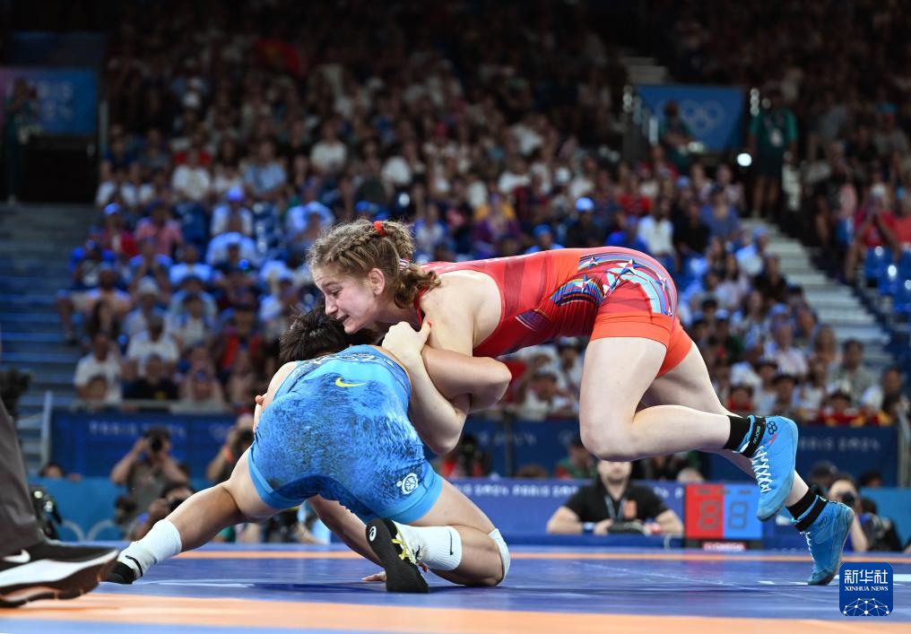 8月6日,在巴黎奥运会女子自由式摔跤68公斤级决赛中,美国选手阿米特(右)战胜吉尔吉斯斯坦选手茹马纳扎罗娃,获得冠军。新华社记者 武巍 摄