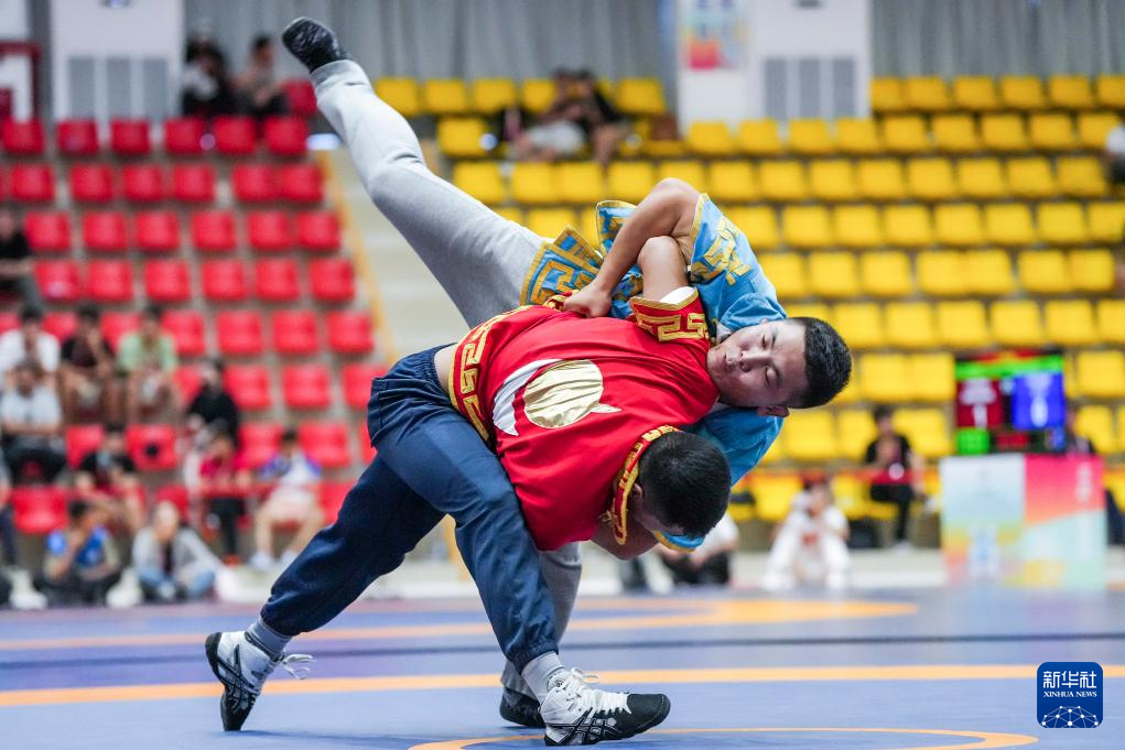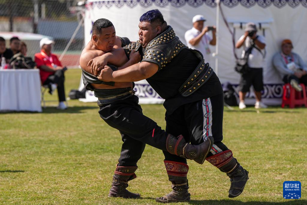 11月27日,海南队选手额尔敦朝古拉(左)与广东队选手布仁吉日嘎拉在北嘎74公斤级决赛中。新华社记者 胡超 摄
