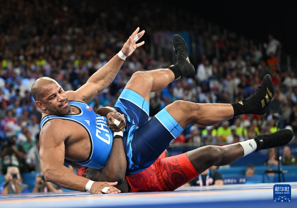 8月6日,巴黎奥运会男子古典式摔跤130公斤级决赛在巴黎战神广场举行。古巴选手米哈因·洛佩斯与智利选手阿科斯塔·费尔南德斯(前)在比赛中。最终米哈因·洛佩斯夺冠。新华社记者 武巍 摄
