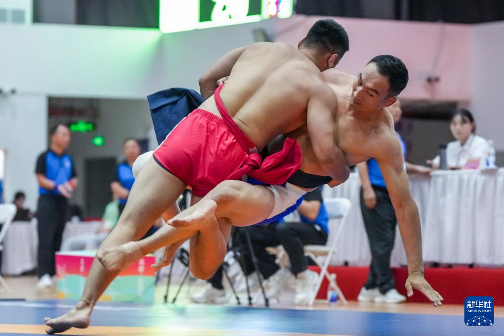 11月28日,上海队选手套力(左)和内蒙古队选手斯恩格嘎日布在比赛中。当日,在海南省三亚市举行的第十二届全国少数民族传统体育运动会民族式摔跤搏克男子团体决赛中,上海队战胜内蒙古队,获得一等奖。新华社记者 胡超 摄