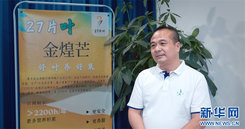 雷丰芒果负责人介绍今年新推出的“27片叶”品牌。新华网发(曾振刚 摄)