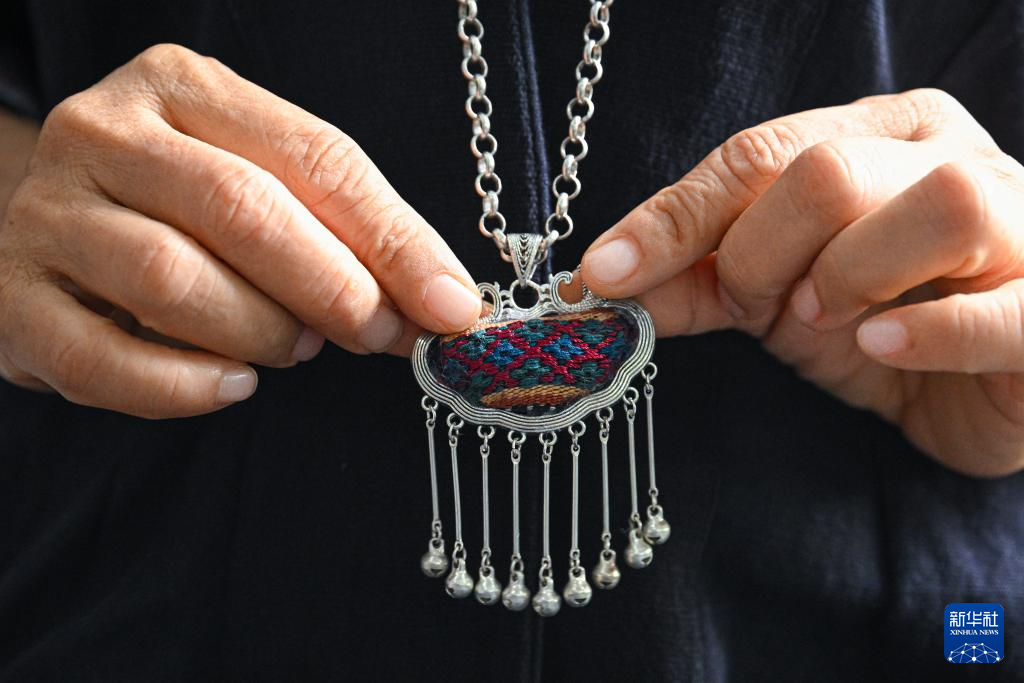 黎族织娘在位于海南省东方市东河镇的家中展示含有黎锦元素的吊坠(2023年6月7日摄)。新华社记者 蒲晓旭 摄