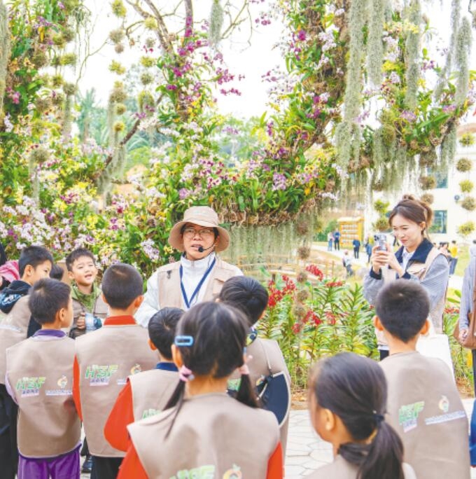 12月28日,七仙岭全球热带水果博览中心焕新亮相。图为新增设的“植物寄生”展示区域内,工作人员给小学生们进行科普。海南日报全媒体记者 袁琛 摄