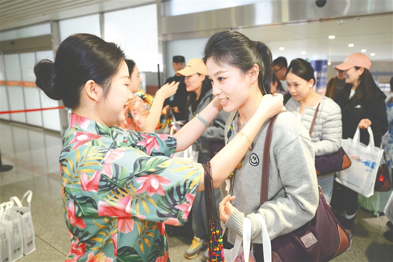 一下飞机就碰上这样的“见面礼”,这让来自杭州的游客吴卉感到惊喜。吴卉是海南旅游的常客,她告诉海南日报全媒体记者,自己经常来海南旅游度假,很享受在海南休闲放松的每一天。“这次我打算在三亚‘宅’在酒店里休息,对于我来说,来海南能得到很疗愈的放松状态。”