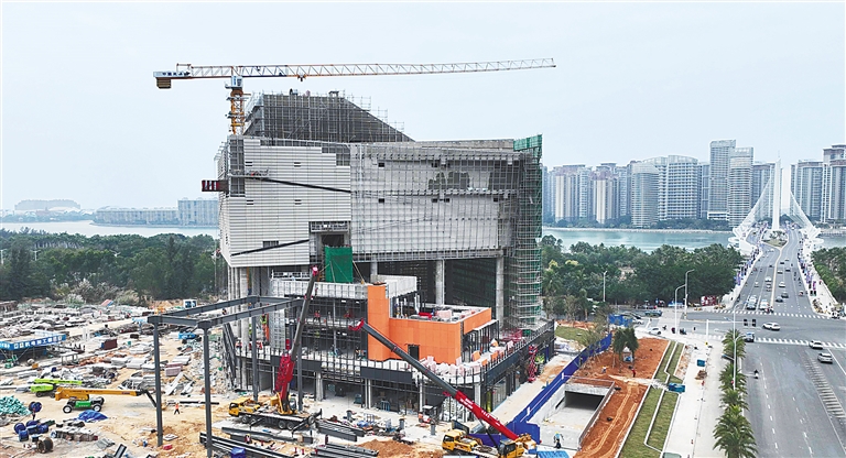 1月2日,儋州环湾新区邻里中心项目(一期)施工现场,工人在进行二次结构工程、精装修工程、外立面幕墙工程以及室外园林工程施工。目前,该项目主体结构已封顶,整体进度完成70%。