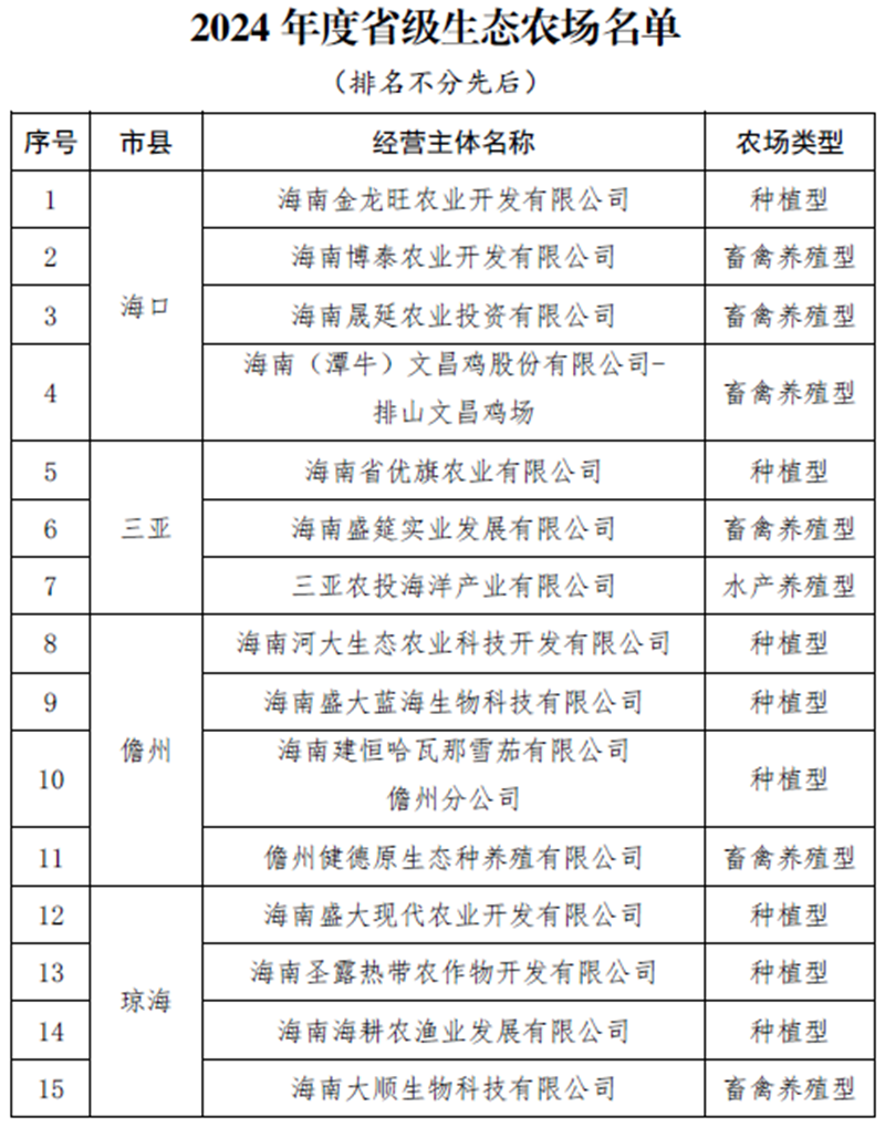近日,海南省农业农村厅发布《海南省农业农村厅关于公布2024年度省级生态农场评价结果的通知》,决定授予53家主体省级生态农场称号。其中,琼中黎族苗族自治县8家主体上榜。