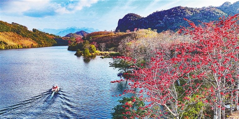 近日,在昌江七叉镇尼下村昌化江畔,木棉花陆续绽放,游客们乘坐游船赏花,感受春天的气息。海南日报全媒体记者 陈元才 通讯员 杨耀科 图/文