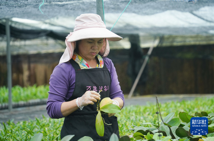 五指山市什会村村民正在打理兰花。新华社记者 樊雨晴 摄