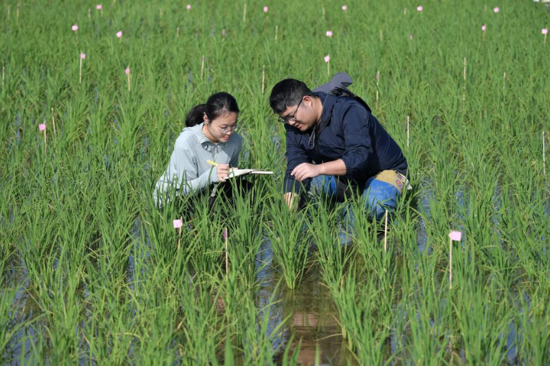 2月10日,在国家耐盐碱水稻技术创新中心崖州湾总部科研试验基地,科研人员在调查水稻农艺性状。 新华社记者 赵颖全摄