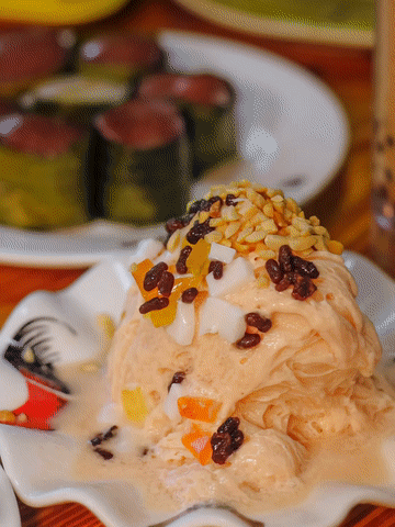 以新鲜斑斓叶榨汁,加入面粉、白糖和鸡蛋制成面糊,煎成薄饼后淋上炼奶,香气浓郁。