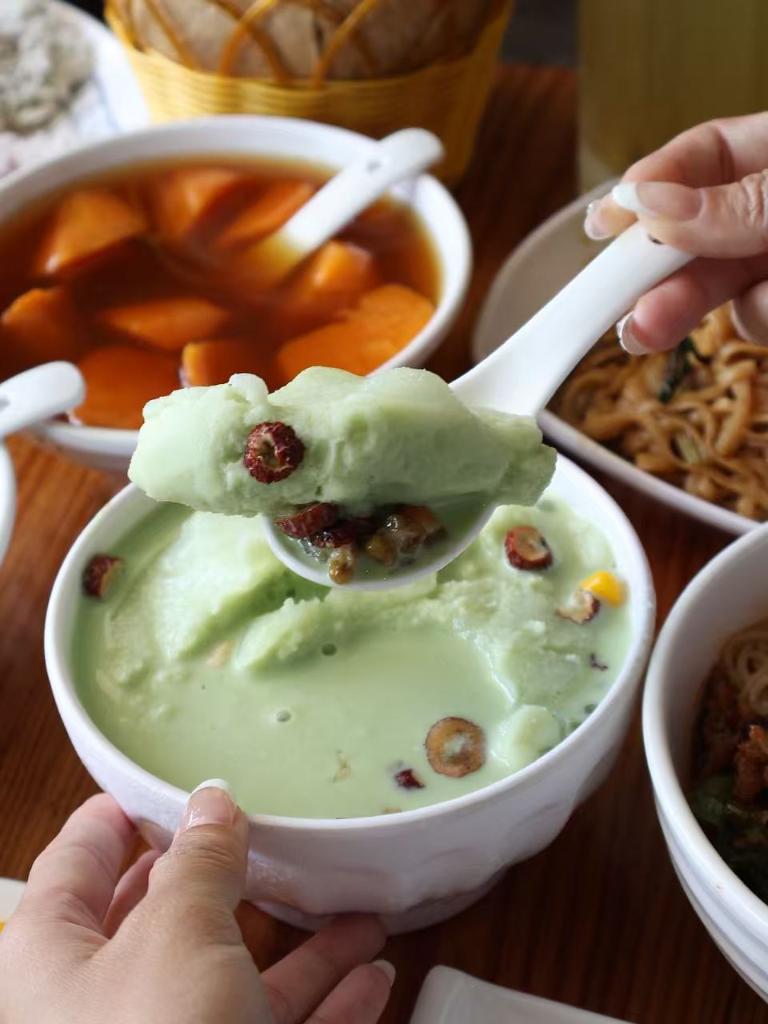 “鸡屎藤”是一种具有独特气味的植物,当地人常吃以解暑。将鸡屎藤叶与米粒一起磨成浆,搭配红糖水或椰奶,制成甜而不腻、香气独特的甜品。