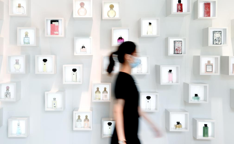 2021年4月19日,消费者从海南博鳌免税店的香水柜台前经过。新华社记者 郭程 摄