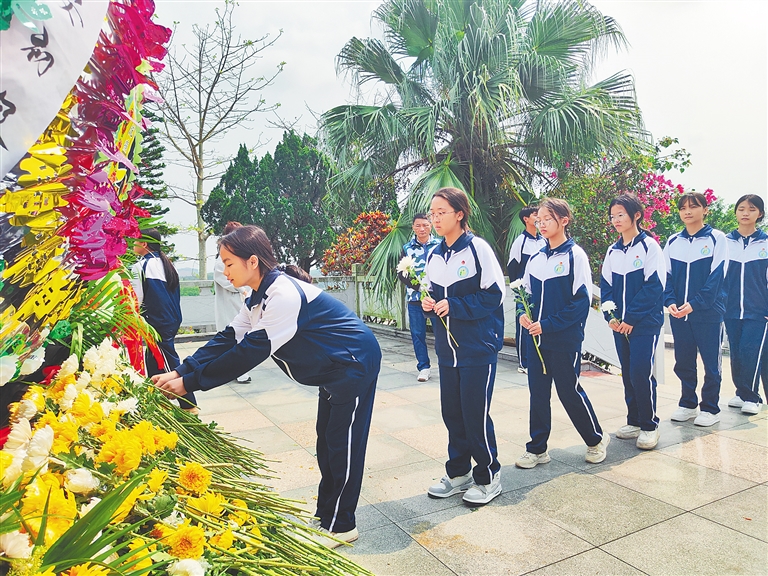 4月2日,万宁后安中学学生在六连岭革命烈士陵园敬献鲜花。通讯员 符桃心 摄