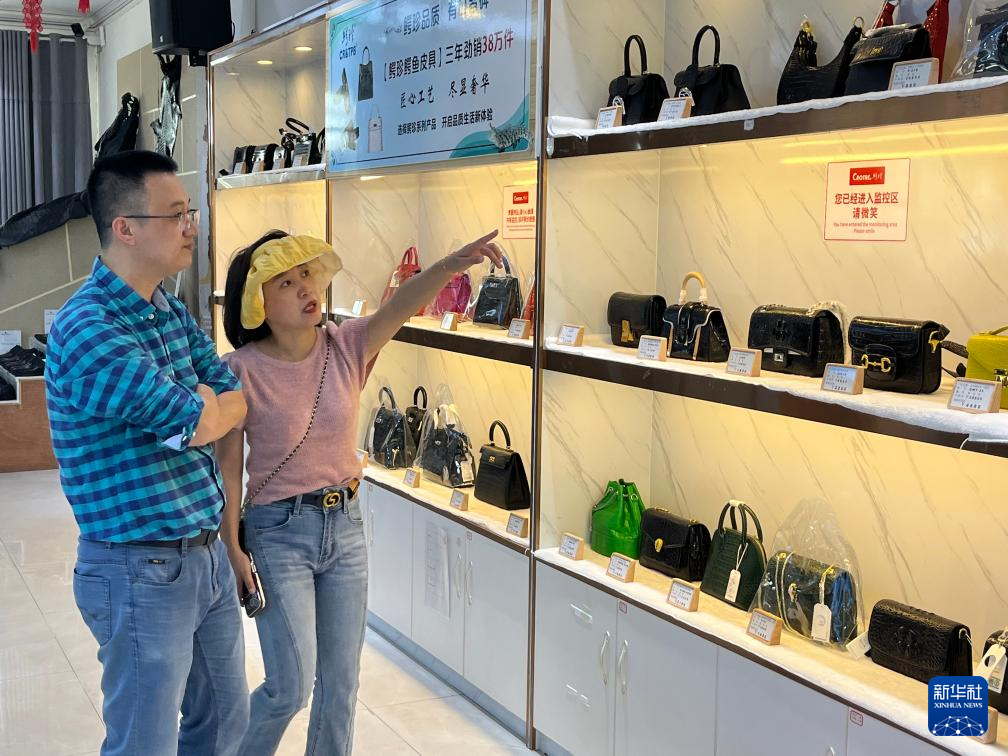 游客在鳄珍鳄鱼园的产品展销区选购鳄鱼皮具。新华社记者 罗江摄