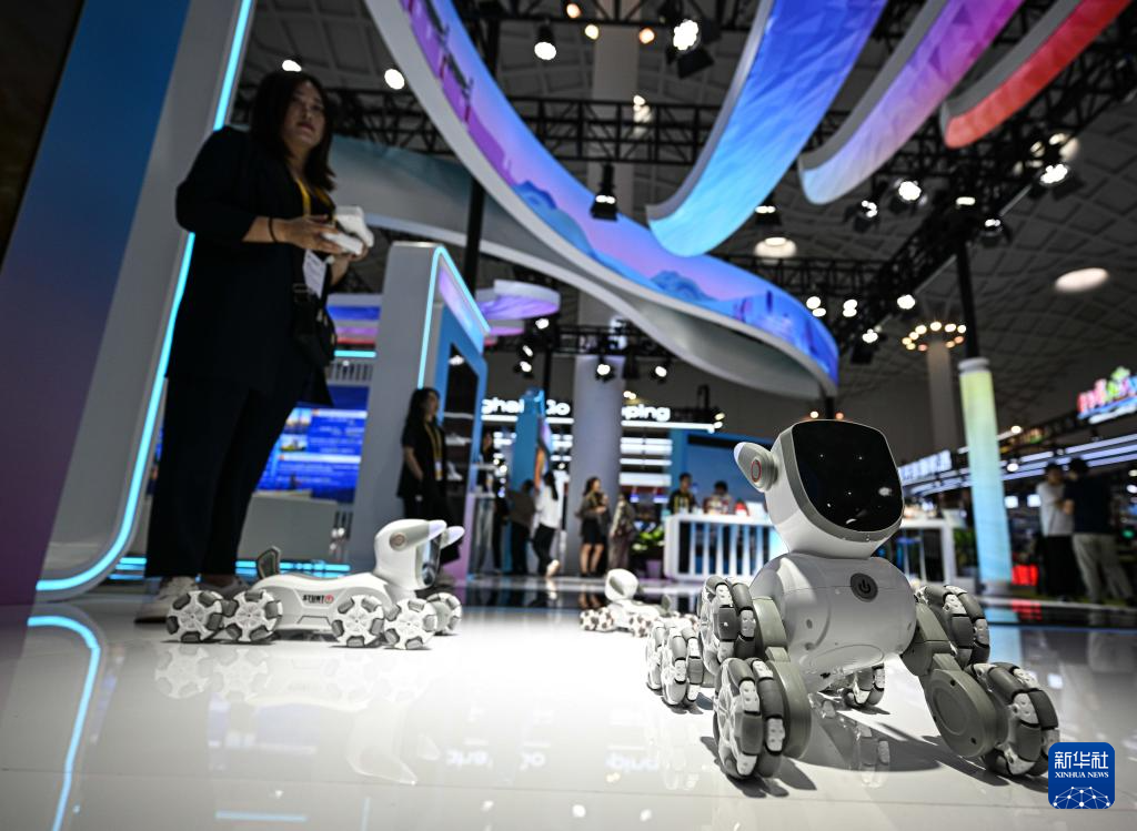 4月13日,工作人员在第五届消博会北京展区进行遥控机器狗玩具演示。新华社记者 蒲晓旭 摄