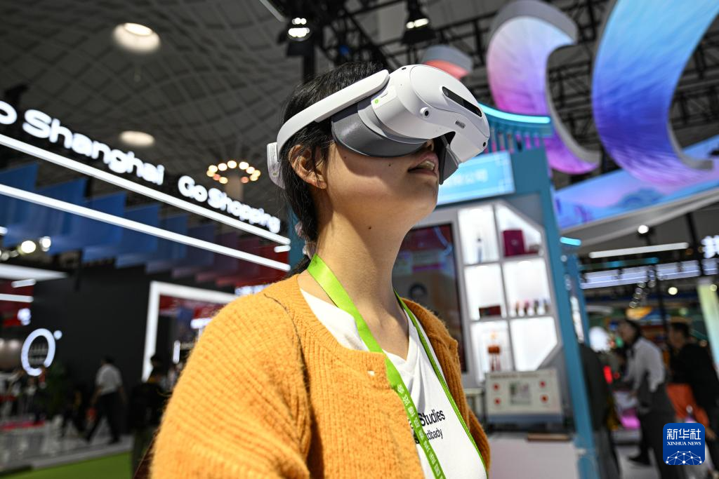 4月13日,观众在第五届消博会北京展区体验一款VR产品。新华社记者 蒲晓旭 摄