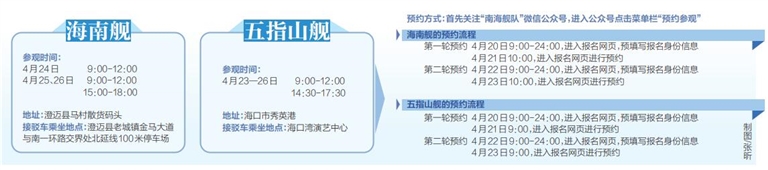 海南舰的开放时间为4月24日至26日,地址为澄迈县马村散货码头。五指山舰的开放时间为4月23日至26日,地址为海口市秀英港。