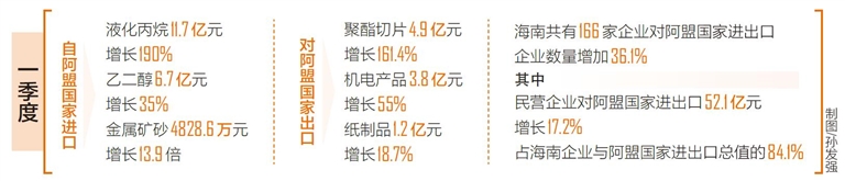 从海口海关提供的统计中可以发现,海南正充分发挥资源禀赋优势深度融入阿盟国家产业链,贸易规模不断扩大。一季度,海南自阿盟国家进口液化丙烷、乙二醇、金属矿砂等生产资料分别为11.7亿元、6.7亿元、4828.6万元,分别增长190%、35%、13.9倍;对阿盟国家出口聚酯切片、机电产品、纸制品分别为4.9亿元、3.8亿元、1.2亿元,分别增长161.4%、55%、18.7%,出口光伏产品、电动汽车等也大幅增长。