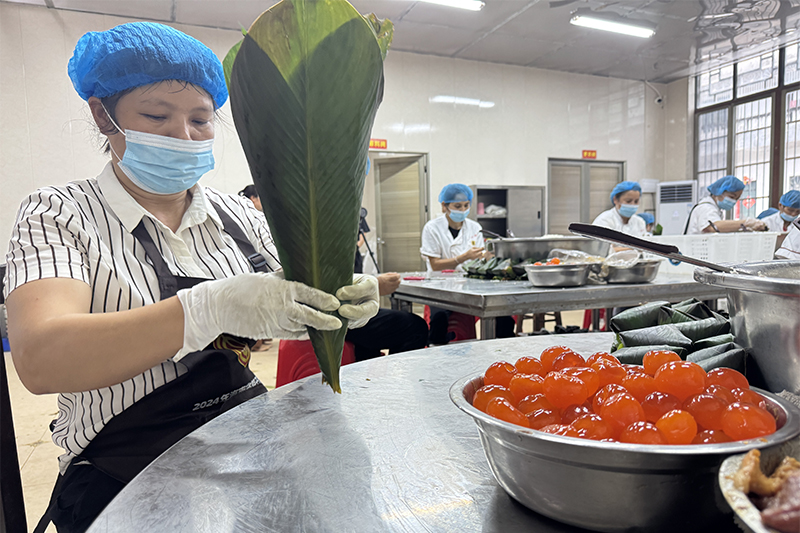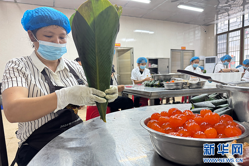 5月15日,在海南省屯昌县屯城镇一家粽子加工厂,工人正包制粽子。新华网发